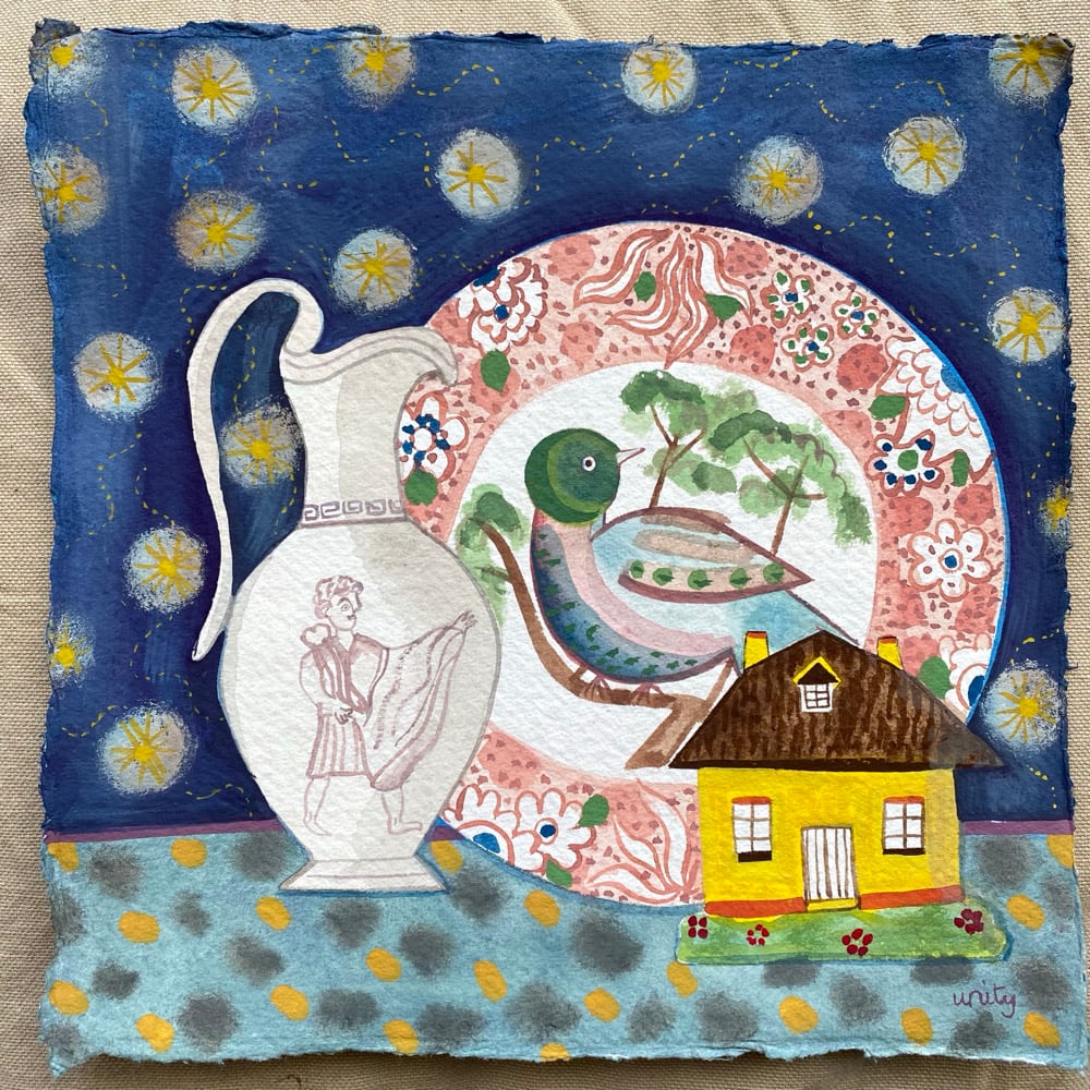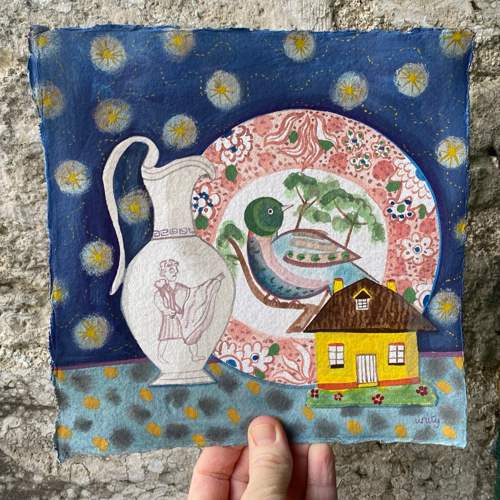 Original painting of three ceramics against a starry patterned background.
